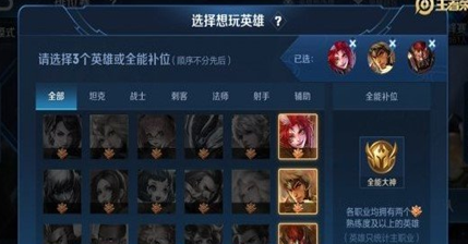 我们新增“全能补位”选项。如果你在各个职业都有非常擅长的英雄,而且也愿意根据队友的阵容进行补位,你可以获得最高规格的炫耀展示。