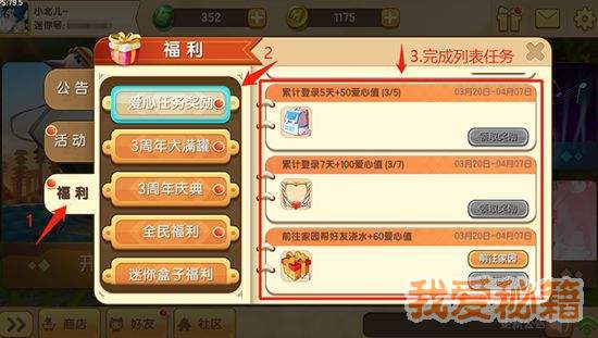 3. 累计登陆2天,即可获取30爱心值和25迷你豆