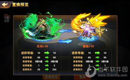 置换之后两个武将的等级、进阶、将星和武将碎片都会完全互换。也就是说,如果玩家原先拥有一个+10的关羽和3个庞统,然后进行置换,置换完成之后,将会有一个+10的庞统和3个关羽。