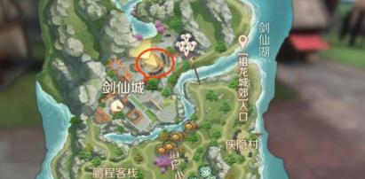在与刘半仙对话后,便会以红色字体为提示,要求我们自己去寻找到相应位置。所以我们在剑仙城地图中,只需要一路向城南飞行即可找到。为了能够更好的让小伙伴们一目了然,这里大山君也放上一张关于NPC刘半仙所指的地点。