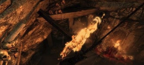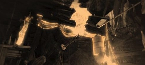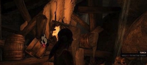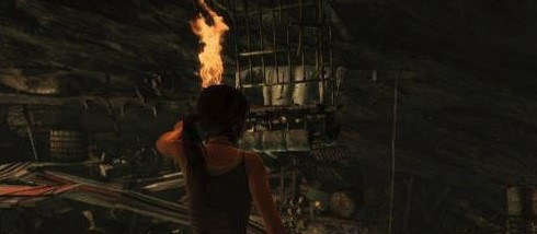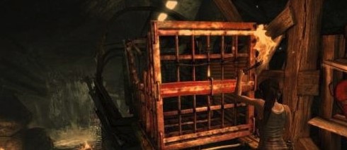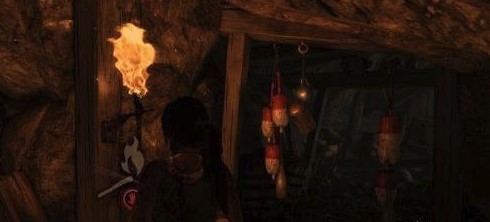 一段前行之后,劳拉来到了处于两面水帘之间的洞穴,启用求生本能(按Q)啦!好好利用场景中发亮的物体逃出生天,重新拿到火之后我们把前面拴住水闸的两根木棒烧掉,之后水闸便会落下,拦住经过的货物.