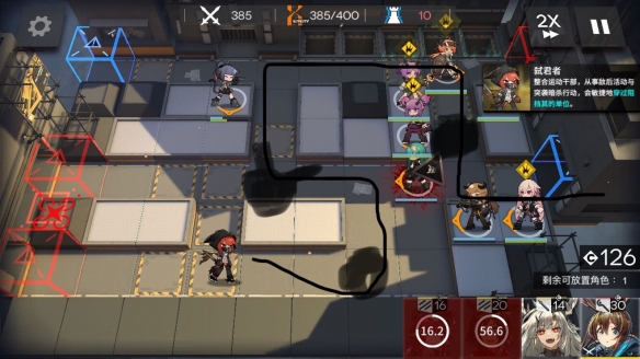 难点4:到了385会出现boss弑君者。boss会按照黑笔画的路线行进,并且在标的这几个黑点处停留,如果有信心的话可以在右下和左上两个点放干员配合狙击直接打死boss。