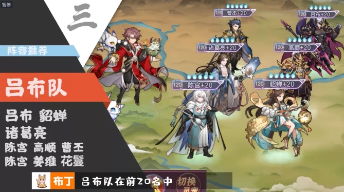 1、吕布队在前20名中,一般有3或者4队。吕布作为一大猛攻本身输出不错,作为羁绊的貂蝉在改版后也能够提供相当好的控场能力。