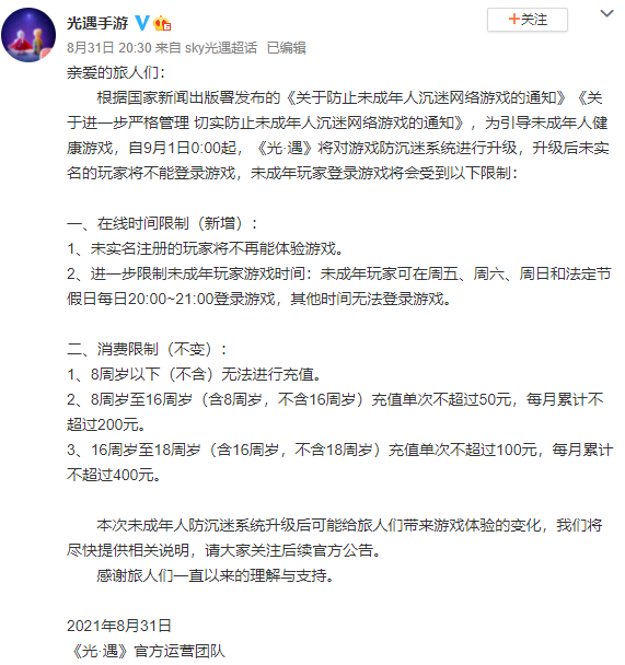 国内所有非单机游戏都受到影响。而光遇的影响尤其大,因为这个游戏普遍低龄化。光遇的定位是适合8岁以上玩家。 保守估计,光遇这游戏至少有一大半未成人。