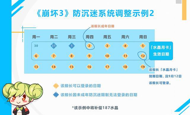 由于防沉迷系统限制,舰长B无法于8月31日、9月1日(周二,周三)登录游戏,而在9月2日他已成年,可以正常登录游戏。那么「水晶月卡」剩余生效期内,他因未成年在线时长限制无法登录的日期总共有2天。他会通过邮件获得(2÷15)x500+2x60=187水晶的补偿。