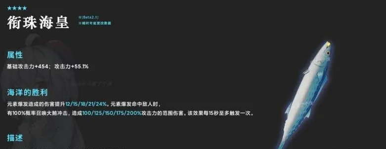 元素爆发造成的伤害提升12%。元素爆发命中敌人时,有100%概率召唤大鲔冲击,造成100%攻击力的范围伤害。该效果每15秒至多触发一次。