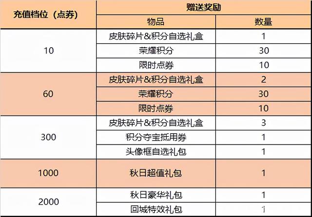 皮肤碎片、荣耀积分、限时点券、积分自选礼盒以及回城特效礼包等奖励!