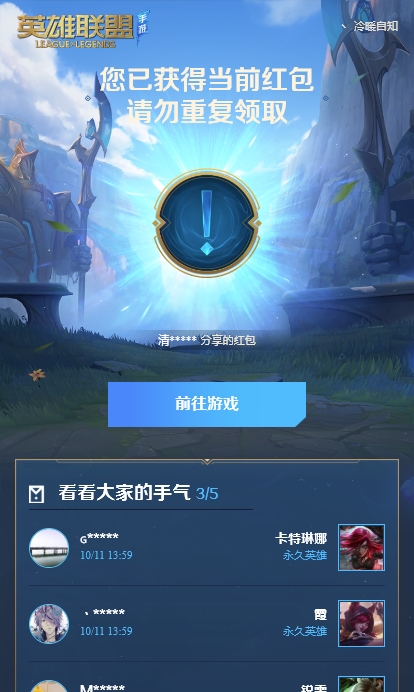 4、这个红包其实是有规律的,每个人必得2个皮肤和4个英雄,所以大家都勤分享,最好是五个人互相分享,这样就能拿到五个,最多是能拿6个红包奖励的,可以说是非常的不错了。