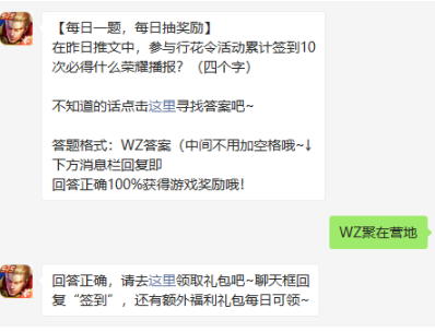 在昨日推文中,参与行花令活动累计签到10次必得什么荣耀播报?(四个字)?