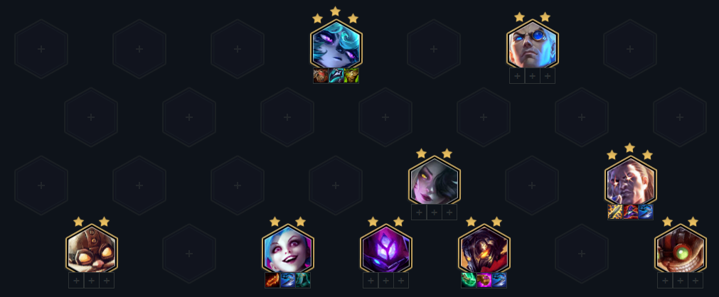 这套阵容的策略的是速七找卢锡安和薇古丝,2-1不搜牌升四,开3约德尔配合2极客等羁绊打前期连胜,装备给EZ先打工,2-3升五抢节奏,最好可以上个机器人开2保镖。