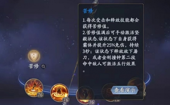 棍的被动为“苦修”。触发“苦修”的前置条件为:自身受击和释放技能获得苦修值,苦修值足够才可开启。其作用可为角色本身提供强有力的减伤,激活坚毅状态可以获得霸体和免伤效果,搭配技能【放下屠刀】和【金刚撞钟】的第二段,命中敌人还可激活五行效果,进一步削弱敌方攻势。