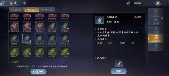 《八龙出海》、《坐忘经》、《五岳四圣棍》、《混元功》都是棍独属的内功招式,品级分别为红→金→紫,红金内功较为难得,这里着重介绍紫色品阶的《混元功》,装配之后可让棍的招式伤害增加5%,搭配一些容易获取的蓝色品级通用内功,在输出、防御、控制方面都有着不错的表现。