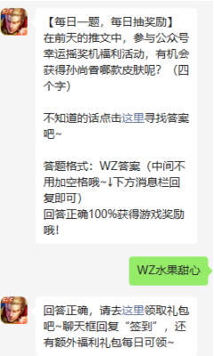 在前天的推文中,参与公众号幸运摇奖机福利活动,有机会获得孙尚香哪款皮肤呢?(四个字)?
