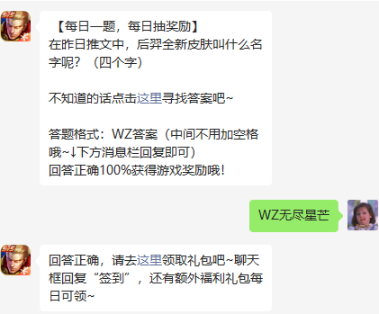 在昨日推文中,后羿全新皮肤叫什么名字呢?(四个字)?