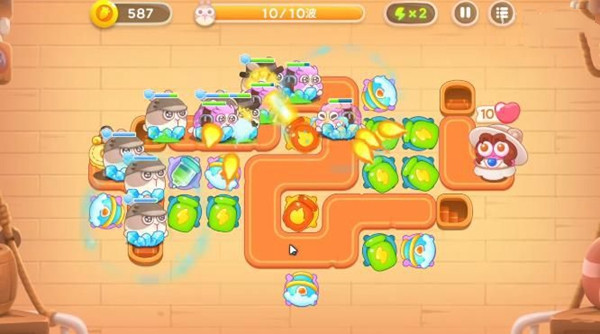 1.最开始在终点造两个炮台,升级后快速清理旁边的障碍物,这一关还与新的气球兔子