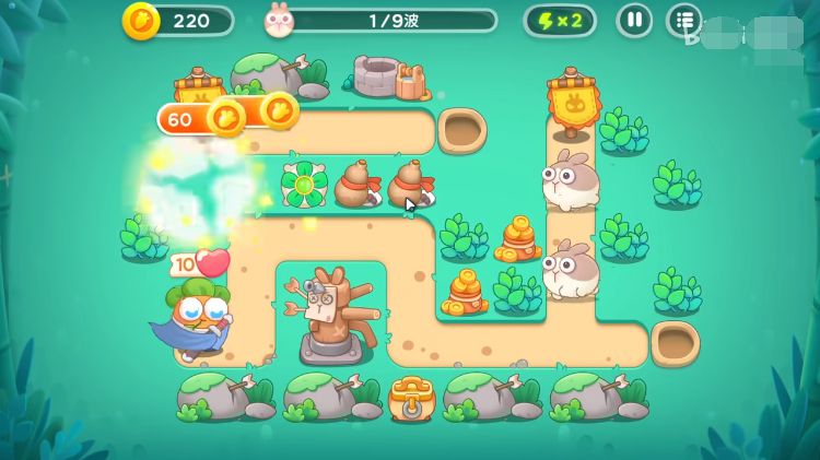 3、开完附近的图后在路径附近种上炮塔,要种两个防空的炮塔,这一关有会飞的兔兔。