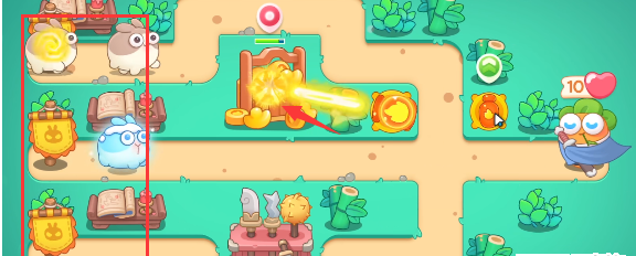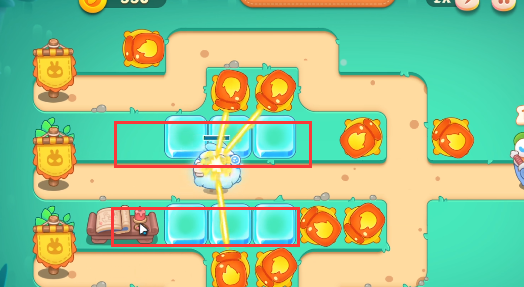 5、最后一波的时候,在兔兔出口处的地方建立一些炮塔,下图框框的位置就是冰冻兔冷冻的位置,不要把炮塔建立在里面。