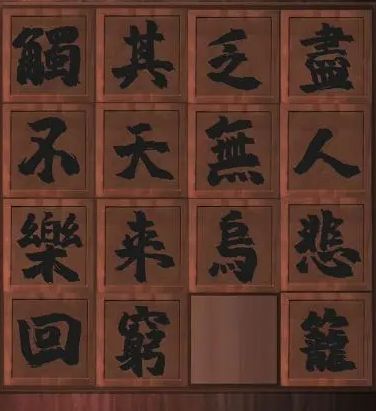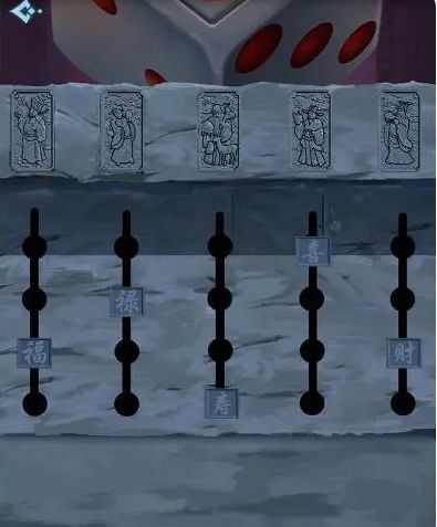 【酒杯】装水倒入花瓶得到【乐字滑块】,左边房间找到【1枚钱币】按照柜子图案在旁边机关摆放,如下图,拿到【人偶头部】放到右边房间柜子上如图2点击,舌头上放【玉牌】得到【其1乐2无3穷4】,在挂画后的机关放上滑块,将点和字对应。