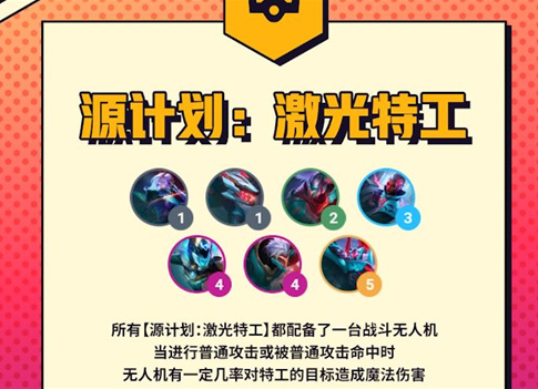 所有源计划特:激光特工的会分配到一台战斗无人机在进行普攻或者被普攻命中时无人机有几率对该特工攻击的目标造成魔法伤害。