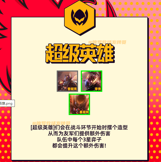 [超级英雄]们会在战斗环节开始时摆个造型从而为友军们提供额外伤害队伍中每个3星弈子都会提升这个额外伤害!