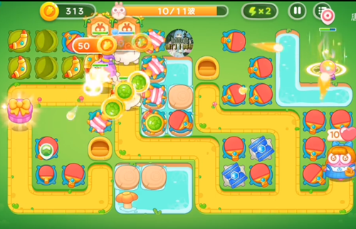 4、这一波是红色的塔炮来攻击右边的草,左边就直接攻击兔子。