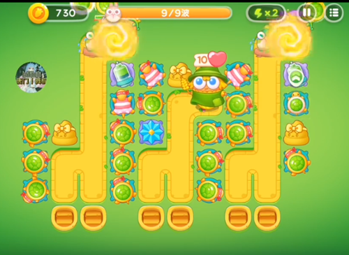 9、最后一波就在左边的道路下面摆放三个乌龟塔来进行攻击道路上的障碍物。